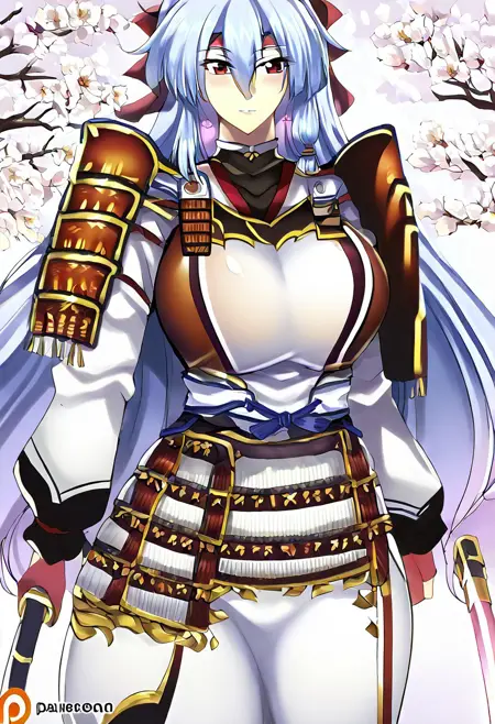 토모에, 1소녀, 혼자, 붉은 눈, 밝은 파란색 머리, 매우 긴 머리, 눈 사이의 머리카락, 갈라진 앞머리, 온이 뿔, 머리 장식, 흰색 머리띠, 사무라이 갑옷, 전통적인 일본 갑옷 플레이팅, 장식용 가슴판, 어깨 보호판, 흰색 하카마 스타일 바지, 갑옷 장갑(검정 및 빨강), 뒤에 추가 카타나, 나기나타,