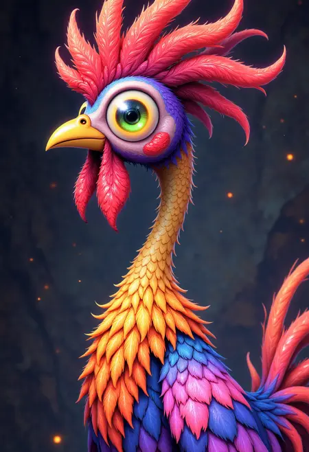 一切始于我偶然看到一张瘦长、长颈公鸡的图片,它古怪又惹人喜爱,于是我给它取名为“Wackadoodle-doo”。我的想象力随之爆发,构建了一个充满奇妙生物的宇宙,于是这个 LoRA 应运而生。虽然最终它比原计划更偏向 3D 风格,但创作各种奇幻动物和角色的过程充满乐趣——完美为你的艺术提示注入额外的奇妙感。