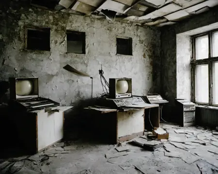 포스트애팔립틱 공장에서, 녹슨 기계, 부서진 창문, 버려진 재료, 파괴된 컨트롤룸.