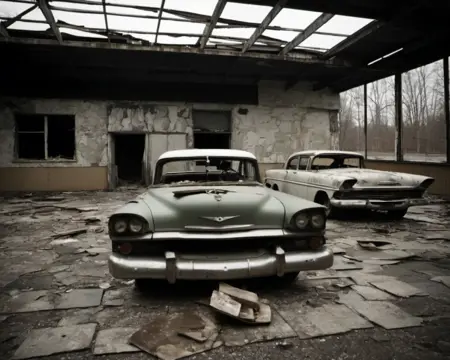 포스트애팔립틱 버려진 작업장에서, 흩어진 녹슨 도구들, 남아있는 기름 냄새, 노랗게 변한 설계도.