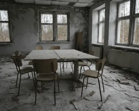 포스트애팔립틱 빈 강당에서, 뒤집힌 책상, 먼지 쌓인 흑판, 노랗게 변한 교과서.