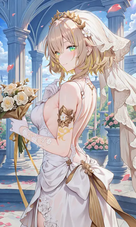 tj_aglaea,无瞳孔,绿色眼睛,纯净的眼睛,成熟,白色连衣裙,白色花朵,金色花饰,系带连衣裙,长裙,白色裙子,侧开衩,分离袖子,金色镶边,希腊服饰,臂甲,棕色盔甲,腕带,金色纹身,项链,裸露肩膀,金色玫瑰,褶皱袖子,短袖,单袖,大腿绑带