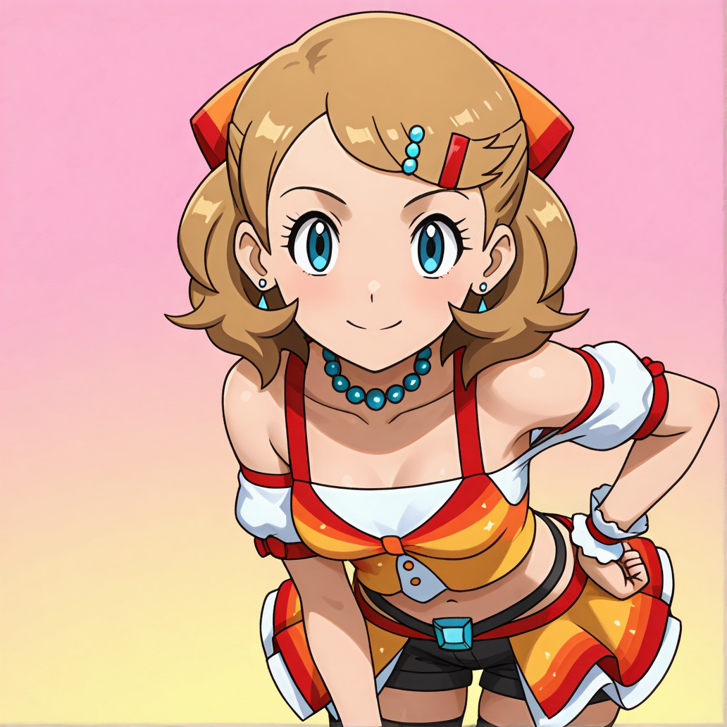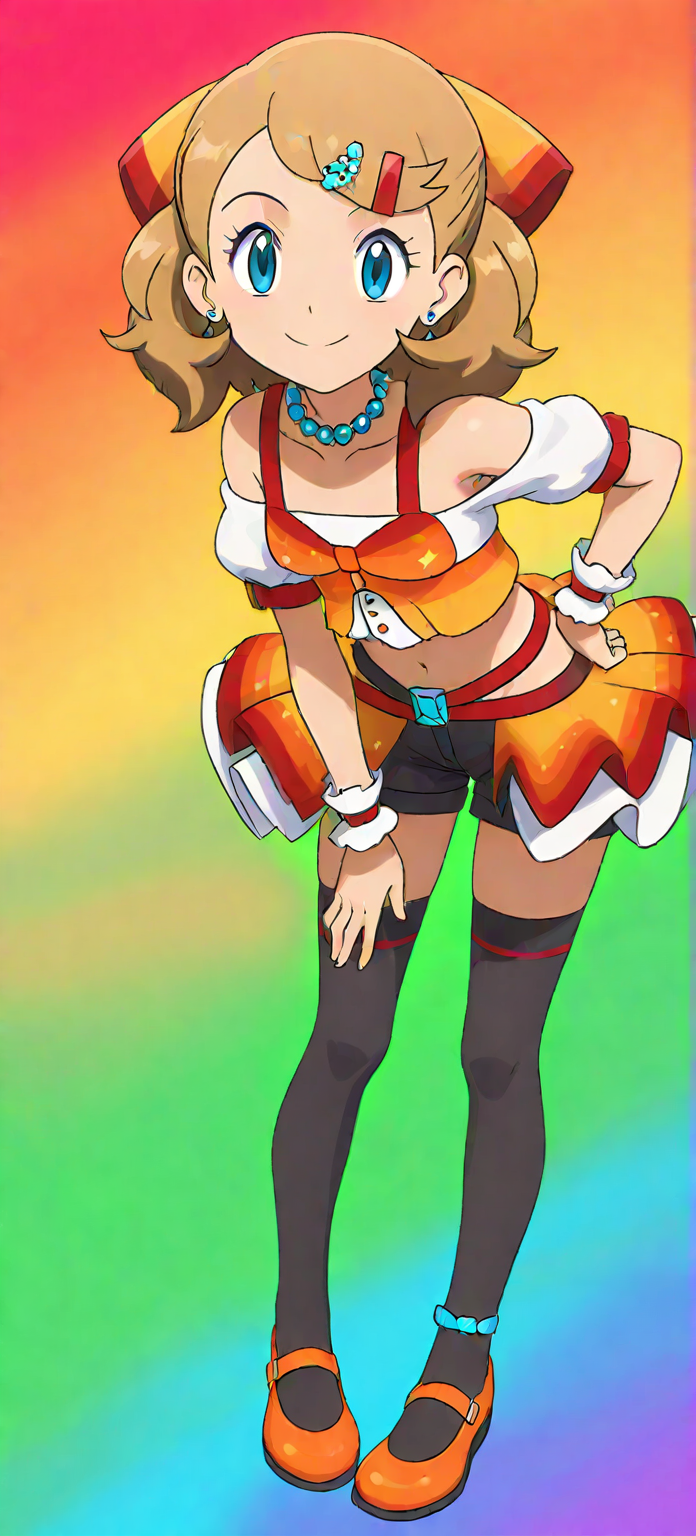 | トレーニングワード | serenacont, serena \(pokemon\), blue eyes, medium hair, light brown hair, aged upコピーしました! hair ornament, hair clip, earrings, off-shoulder, shirt, bare shoulders, short sleeves, wrist cuffs, collarbone, necklace, beads, midriff, navel, skirt, shorts under skirt, black shorts, single anklet, black thighhighs, shoes, mary janes, orange footwearコピーしました! |