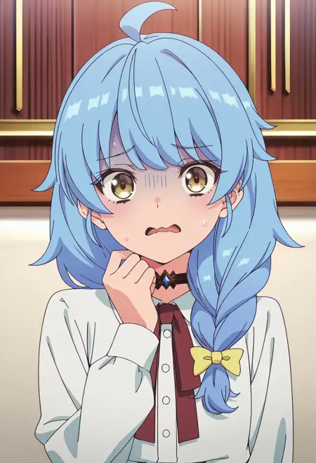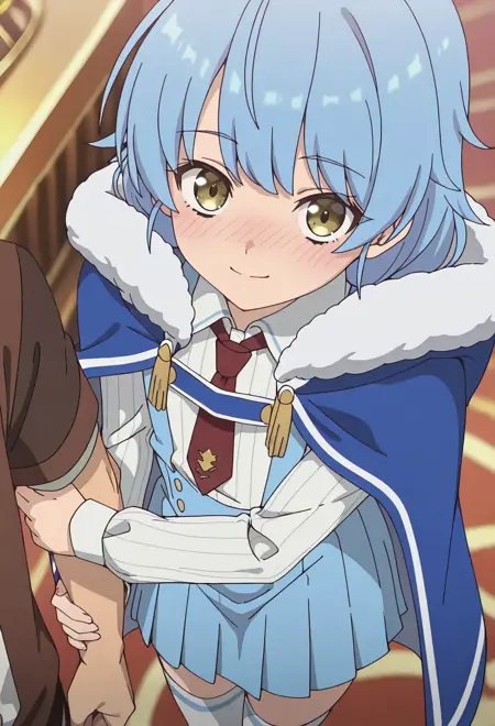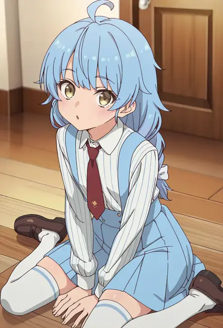 aparidarain-default,yellow eyes, blue hair,ahoge,braided ponytail, blue cape,fur-trimmed cape,striped shirt,white shirt,red necktie,light blue skirt,suspender skirt,white thighhighs, loafers