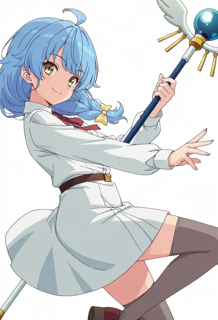 aparidarain-casual,yellow eyes, blue hair,ahoge,single braid,hair bow,yellow bow, white dress,neck ribbon,red ribbon,long sleeves,grey thighhighs, loafers,(belt:0.5)