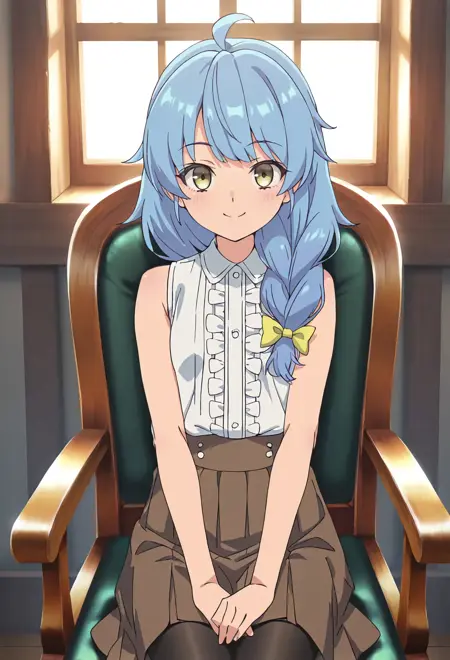aparidarain-default,yellow eyes, blue hair,ahoge,single braid,hair bow,black coat,white shirt,center frills,brown skirt,black pantyhose,loafers