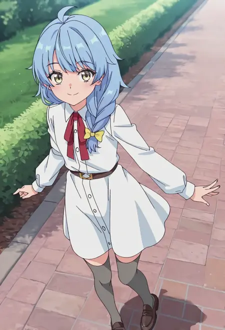 aparidarain-casual,yellow eyes, blue hair,ahoge,single braid,hair bow,yellow bow, white dress,neck ribbon,belt,red ribbon,long sleeves,grey thighhighs,loafers