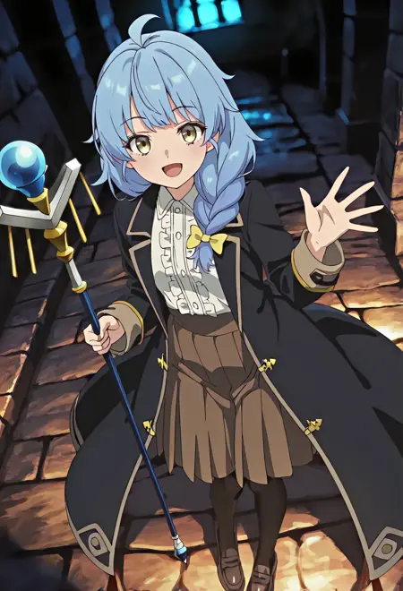 aparidarain-default, yellow eyes, blue hair, ahoge, single braid, hair bow, black coat, white shirt, center frills, brown skirt, black pantyhose, loafers