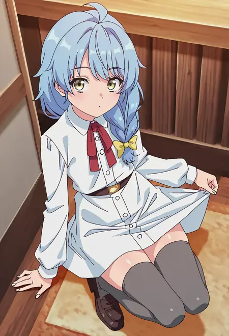 aparidarain-casual, yellow eyes, blue hair, ahoge, single braid, hair bow, yellow bow, white dress, neck ribbon, belt, red ribbon, long sleeves, grey thighhighs, loafers