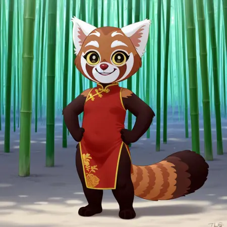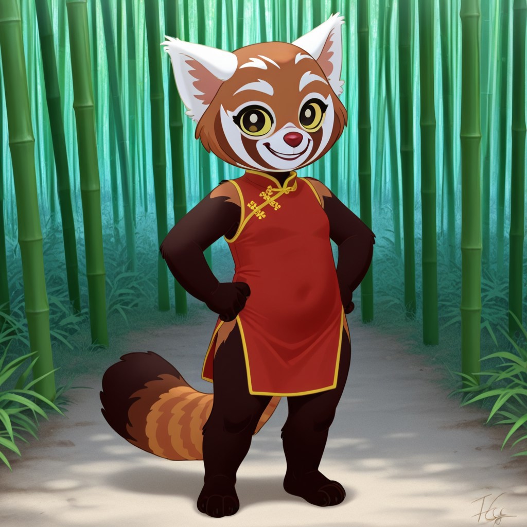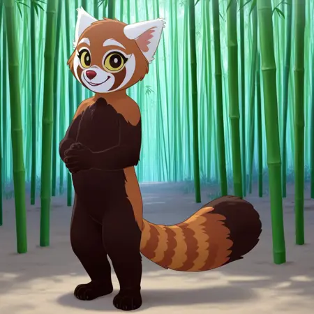 red panda, brown and black fur, white snout, white ears, red nose, Black pupils, yellow sclera, striped tail,