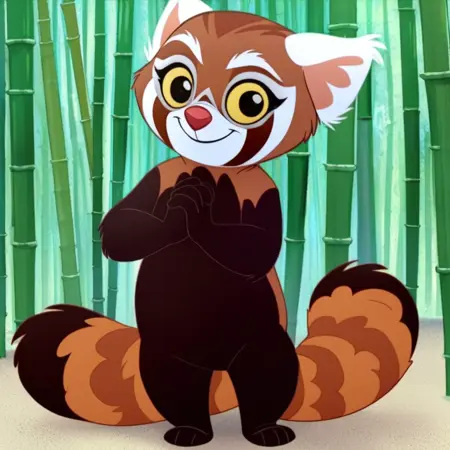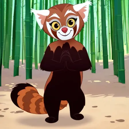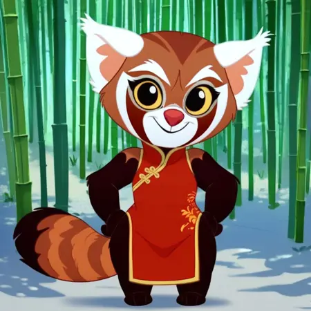 semi-anthro, female furry, red panda, brown and black fur, white muzzle, white ears, red nose, black eyes, yellow sclera, striped tail,
