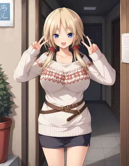 outfit03, 毛衣, 白色毛衣, 毛衣连衣裙, 一体式连衣裙, 长袖, 袖子超过手腕, 背心, 黑色背心, 锁骨, 裙子, 铅笔裙, 黑色裙子, 腰带, 棕色腰带, 腰带环绕两圈,