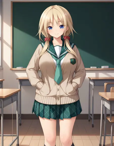outfit01, 卡迪根, 米色卡迪根, 紧身衣服, 闭合式卡迪根, 徽章, 长袖, 袖子超过手腕, 水手领, 绿色水手领, 格子水手领, 锁骨, 领带, 领结, 绿色领结, 裙子, 迷你裙, 百褶裙, 格子裙, 绿色裙子, 袜子, 黑色袜子,