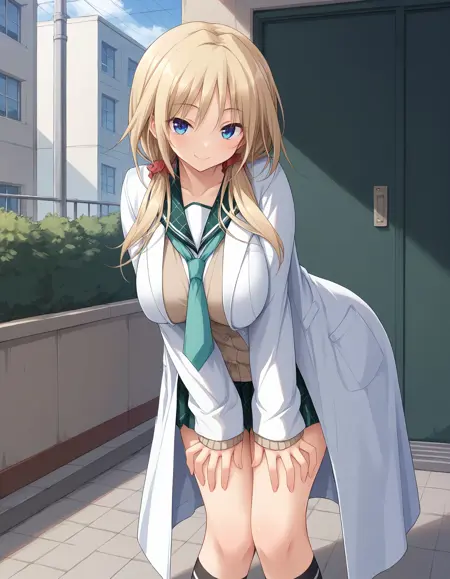 outfit02, 外套, 白色外套, 实验服, 开放式衣服, 开放式外套, 卡迪根, 米色卡迪根, 紧身衣服, 闭合式卡迪根, 长袖, 袖子超过手腕, 水手领, 绿色水手领, 锁骨, 格子水手领, 领带, 领结, 绿色领结, 裙子, 迷你裙, 百褶裙, 格子裙, 绿色裙子, 袜子, 黑色袜子,