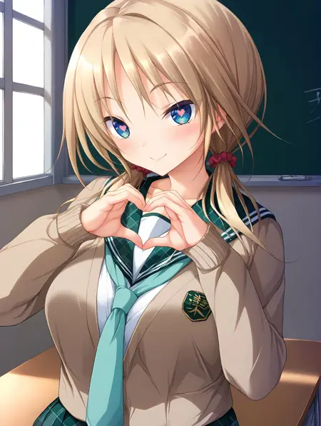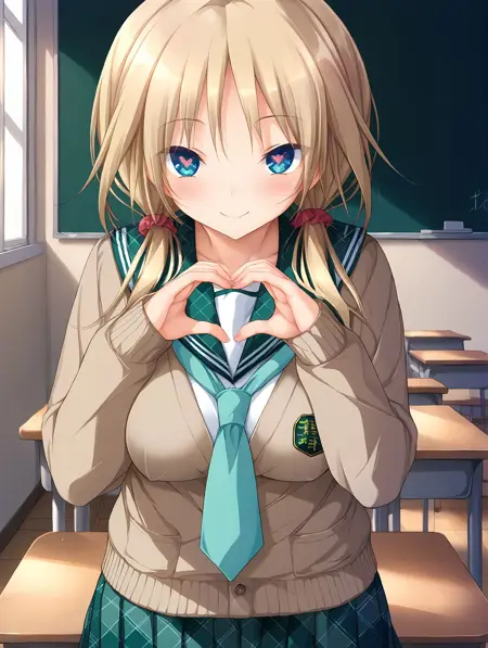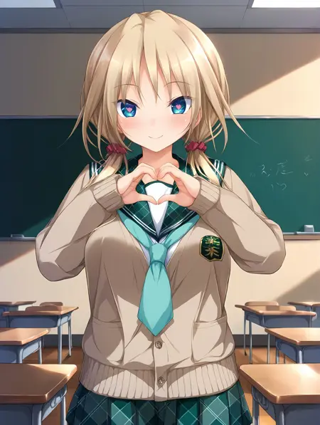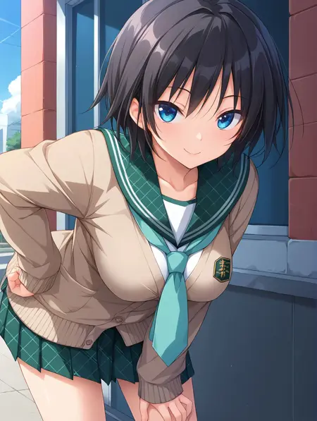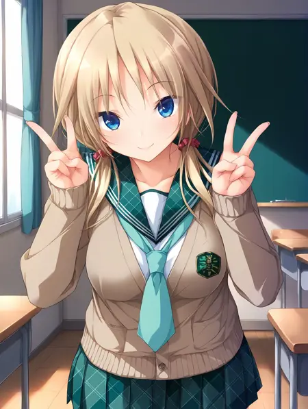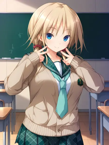 outfit01, cardigan, beige cardigan, close clothes, close cardigan, emblem, long sleeves, sleeve past wrist, sailor collar, green sailor collar, plaid sailor collar, collarbone, tie, necktie, green necktie, skirt, mini skirt, pleated skirt, plaid skirt, green skirt, socks, black socks,
