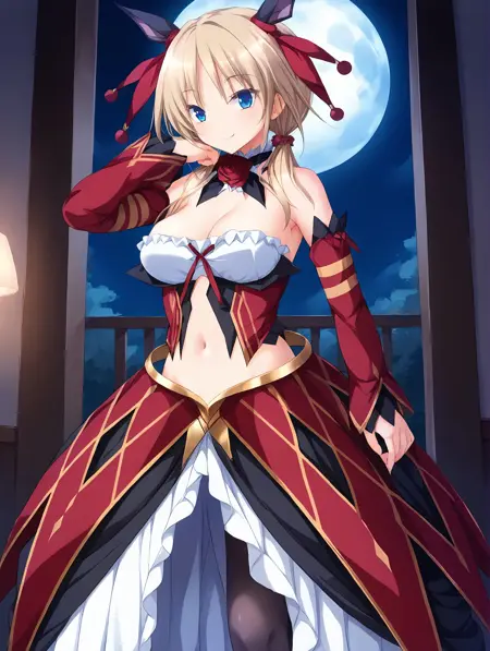 outfit05, demon ears, ribbon on demon ear, dress, sleeveless dress, strapless dress, frilled dress top, red bow dress top, white dress top, argyle dress skirt, layered dress skirt, frilled dress skirt, waist accessary, golden accessary, pantyhose, black pantyhose, midriff, navel, bare shoulder, detached sleeves, sleeve past wrist, detached collar, tie black tie, accessary on tie, rose accessary, demon tail,