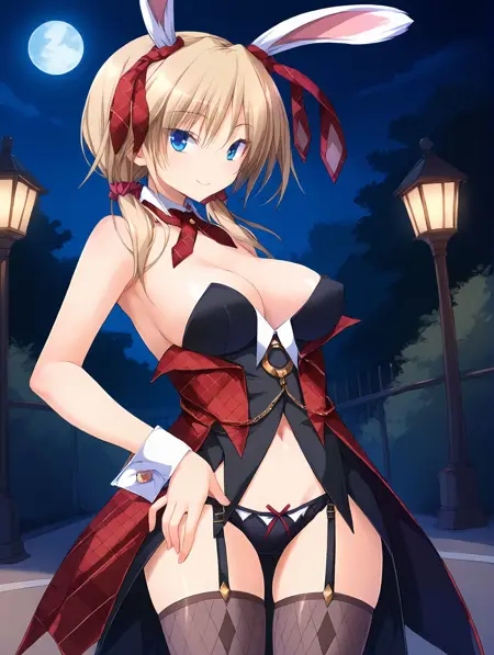 outfit04, fake animal ears, rabbit ear, ribbon, ribbon on rabbit ear, detached collar, tie, red tie, plaid tie, bare top, black bare top, swallow tailed top, waist coat, plaid waist coat, red waist coat, waist coat tails, divided waist coat tails, wrist cuffs, white cuffs, watch accessary, golden watch, chain, golden chain, underwear, pantie, black pantie, bow pantie, red bow pantie, garter straps, thighhighs, argyle thighhighs, fishnet thighhighs, navel, cleavage,