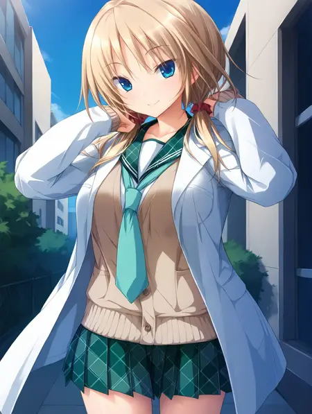 outfit02, coat, white coat, labcoat, open clothes, open coat, cardigan, beige cardigan, close clothes, close cardigan, long sleeves, sleeve past wrist, sailor collar, green sailor collar, collarbone, plaid sailor collar, tie, necktie, green necktie, skirt, mini skirt, pleated skirt, plaid skirt, green skirt, socks, black socks,