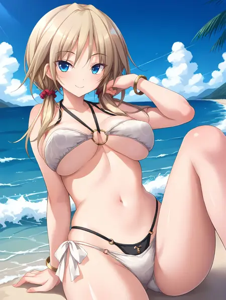 outfit06, bikini, white bikini, O-rings bikini, bikini top, halter bikini top, under boob, layered bikini bottoms, white bikini bottom, side tie bikini bottoms, black bikini bottom, bracelet,