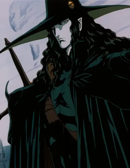 D (바이퍼 헌터 D), 창백한 피부, 혼자, 1남자, 남성 중심, 모자, 날카로운 귀, 검은 머리, 긴 머리, 마녀 모자, 검,