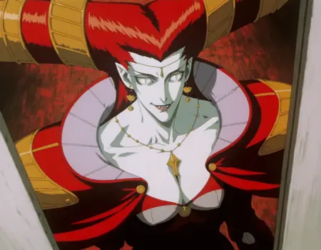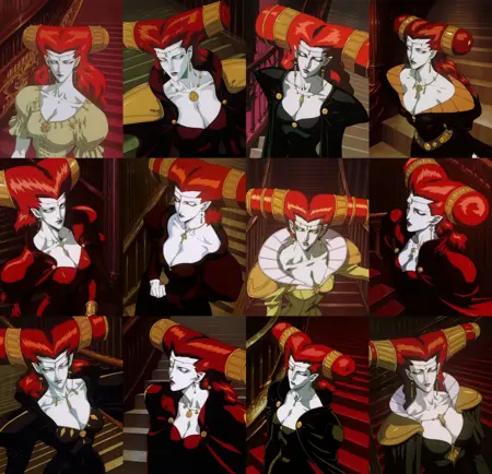카릴라 (바이퍼 헌터 D), 1여자, 보석, 색이 있는 피부, 날카로운 귀, 귀걸이, 빨간 머리, 뱀파이어, 큰 머리 장식,
