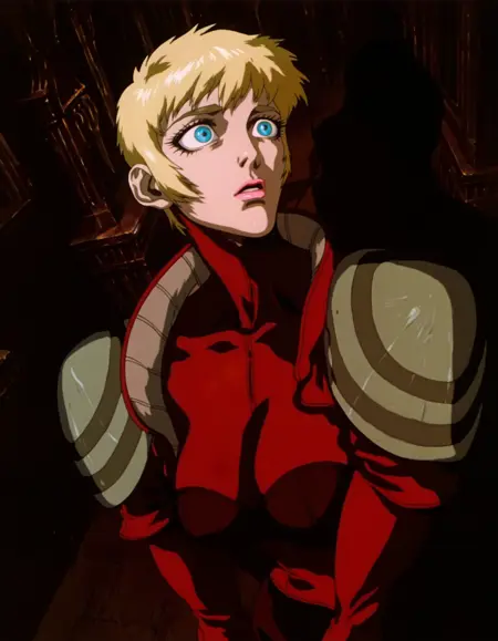 레이라 마커스 (바이퍼 헌터 D), 1여자, 금발 머리, 파란 눈, 짧은 머리, 보석, 귀걸이, 갑옷, 립스틱, 녹색 눈, 메이크업, 어깨 갑옷, 바디수트, 헤드셋, 마이크,