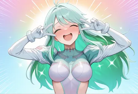 Asc2: colored inner hair, aqua hair, green hair, green eyes, long hair, sidelocks, bodysuit, revealing clothes, clothing cutout, juliet sleeves, gloves, cross