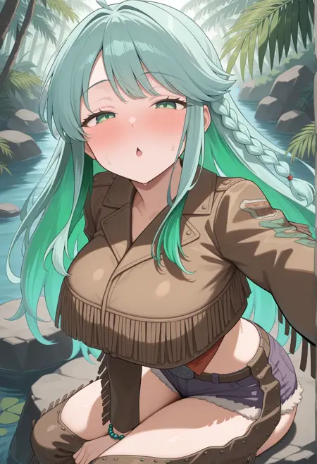 Asc1: colored inner hair, aqua hair, green hair, green eyes, long hair, sidelocks, braid, cropped jacket, Pearl bracelet, jewelry, shorts, belt, chaps, fringe trim