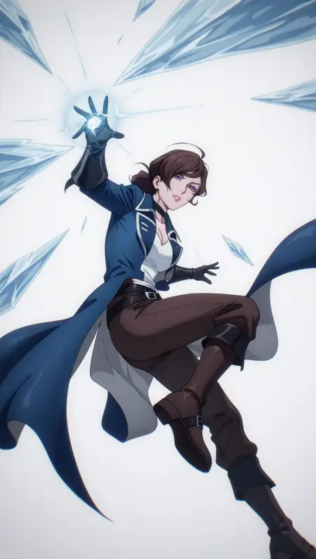 기본 태그: JuliaBelmont, 1girl, brown hair, purple eyes, short hair, black choker, cleavage, black gloves, belt, white shirt, blue long coat, brown pants, black boots