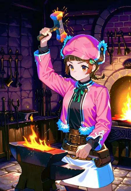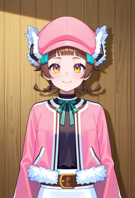 提示词: Rifmonic_scs, 出租车帽, 耳罩帽, 粉色帽子, 双马尾, 刘海, 齐刘海, 侧发, 棕色头发, 粉色夹克, 开襟夹克, 毛皮镶边夹克, 长袖, 颈部丝带, 黑色上衣, 腰带, 裙子, 白色裙子, 背包, 鞘, 背上武器, 黑色袜子, 过膝袜, 粉色鞋子