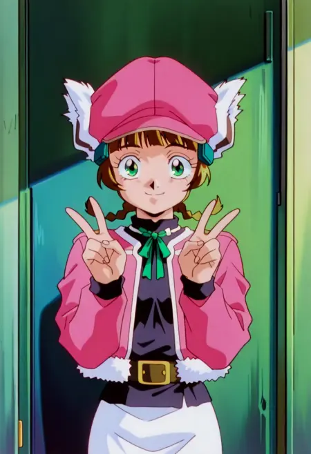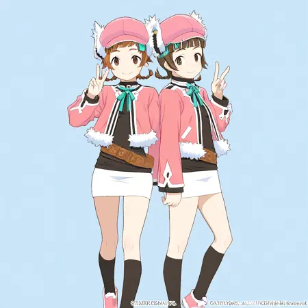 Prompt: Rifmonic_scs, cabbie hat, earflap hat, pink hat, twin braids, bangs, blunt bangs, sidelocks, brown hair, pink jacket, open jacket, fur-trimmed jacket, long sleeves, neck ribbon, black shirt, belt, skirt, white skirt, bag, sheath, weapon on back, black socks, kneehighs, pink shoes