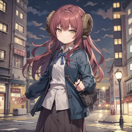 | トレーニングワード | this cartoon picture is of girl, 1girl, solo, skirt, horns, shirt, brown hair, brown footwear, white background, long hair, white shirt, shoes, full body, yellow eyes, outdoors, city background,コピーしました! 1girl, skirt, horns, long hair, yellow eyes, outdoors, city background,コピーしました! |
