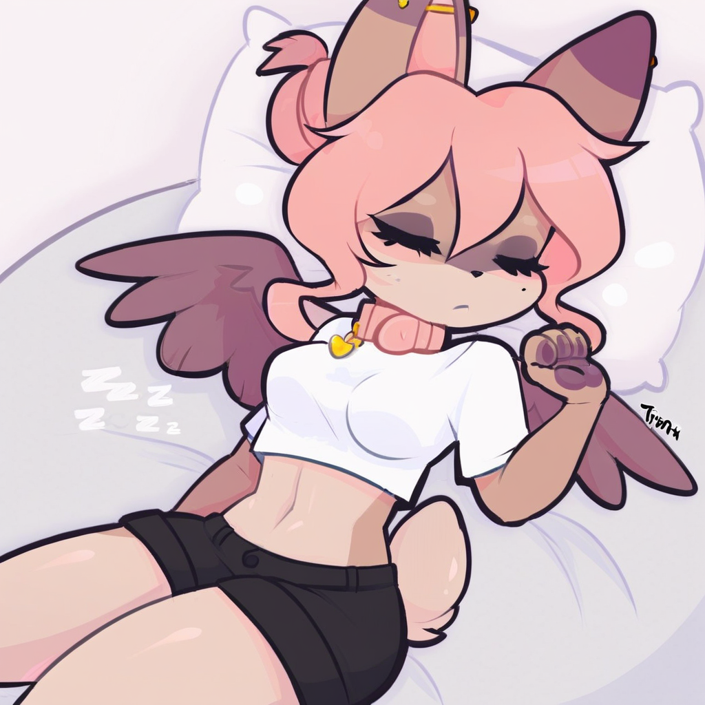 TAGS: Hazel Typh, Hazel, deer cat, cat ears, deer tail, heart-shaped pupils, pink eyes, furry, pink hair, hair bun, wings, pink collar, collar with gold heart,