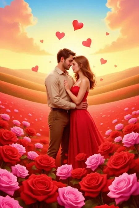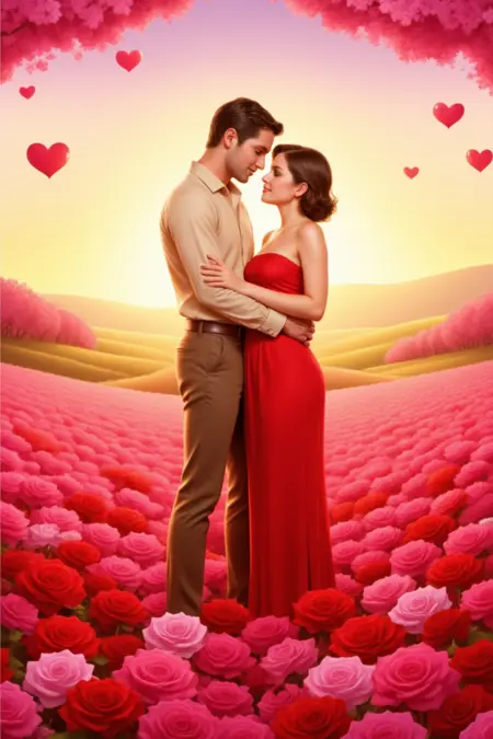 F1CNQRJCouple、鮮やかなデジタルイラストレーションで、夕日が沈む空の下で手をつなぐシルエットのカップルが描かれています。男性はスーツ、女性は赤いドレスを着ていて、ピンクの花と赤い木々に囲まれています。ドragonflyが上空に舞い、 whimsical な雰囲気を加えています。背景は黄色からピンクへのグラデーションで構成されています。