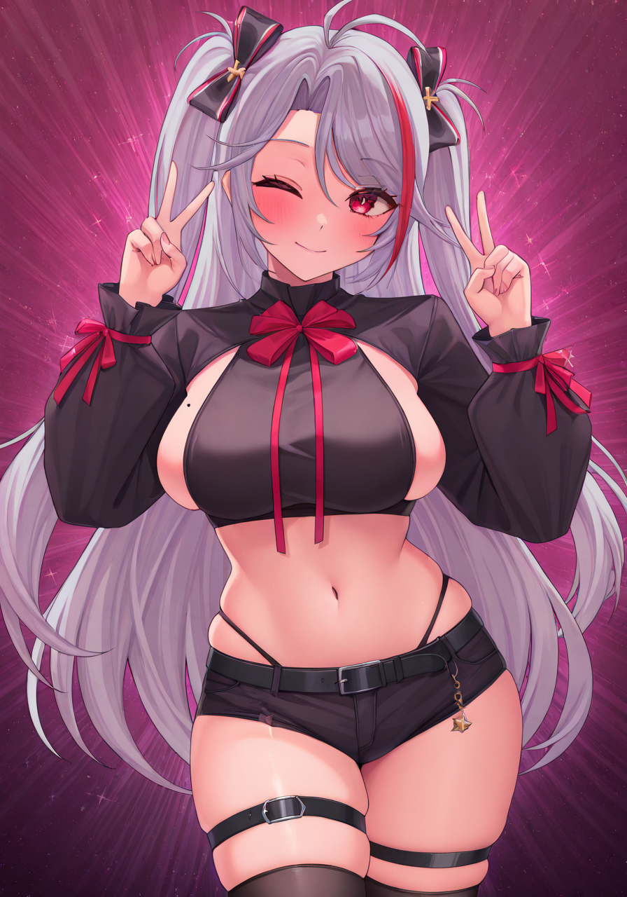 缪斯:PEM,1girl,大乳房,双V形,短裤,肚脐,黑色过膝袜,单眼闭合,多色发,微笑,看向观众,露侧腰,红眼,露脐装,条纹发,长袖,乳房上的痣,双侧上发,红发,薄外套,腰腹部,黑色腰带,刘海,裙褶,脸红,灰发,高腿内裤,闪亮,牛仔镜头,超短裤,大腿绑带,闭嘴,天线发,内衣,黑色短裤,站立,黑色上衣,白发,双手上举,腹部