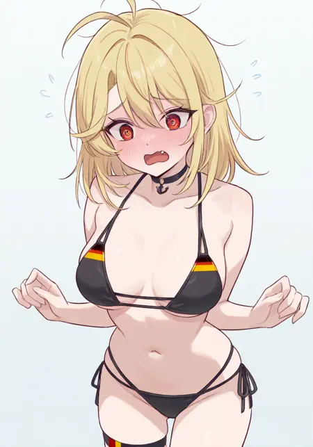 不褪的微笑:PEUS,黑色比基尼,旗帜印花,德国国旗比基尼,肚脐,黑色项圈,单侧大腿绑带,侧系式比基尼裤,黑色丝带,多带式比基尼上衣,锚形比基尼装饰