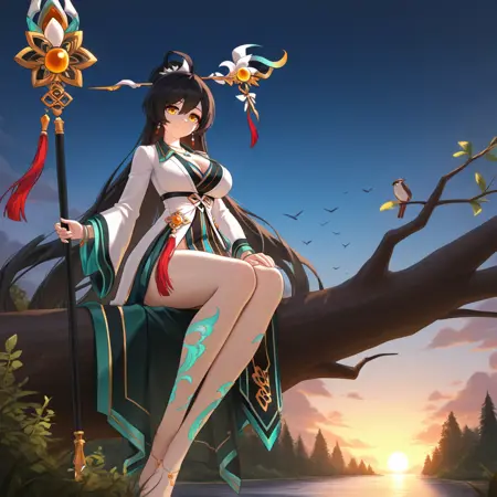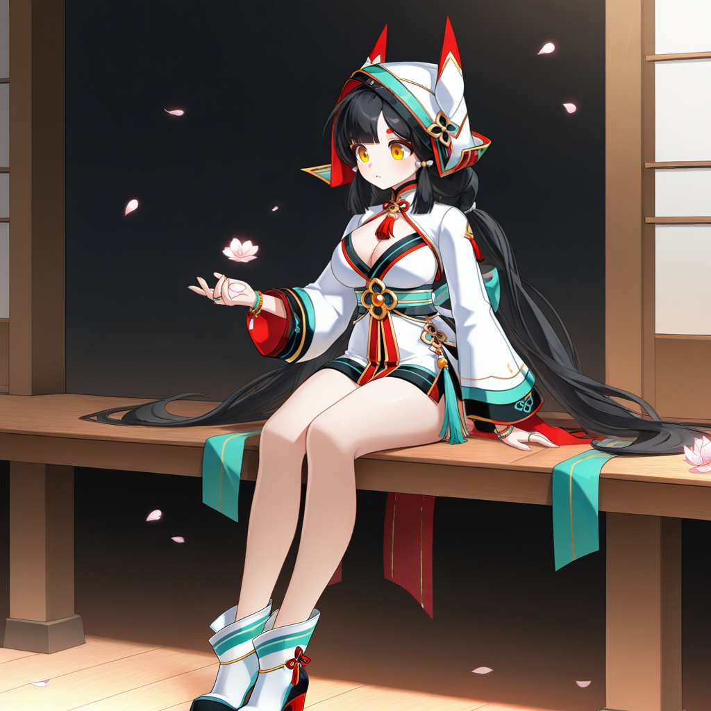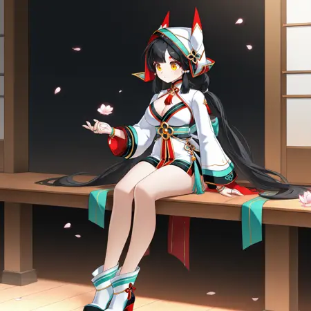 AraEL, Fol001, Arh_Def, 黒髪, 黄色い目, ara haan, ポニーテール, 中国風衣装, サーベルなしシャツ, 白いシャツ, 赤いコルセット, コルセット, オレンジ色のスカート, 肩を露出, 白いふわふわの短い袖, 短い袖が長い袖の上, オレンジ色の袖, 茶色の手首ガード, 髪リボン, 黄色い房, 黄色いリボン, 手首リボン, 白い太ももハイズ, 赤いカラー, 髪留め, オレンジ色の取り外し可能なレッグウォーマー,