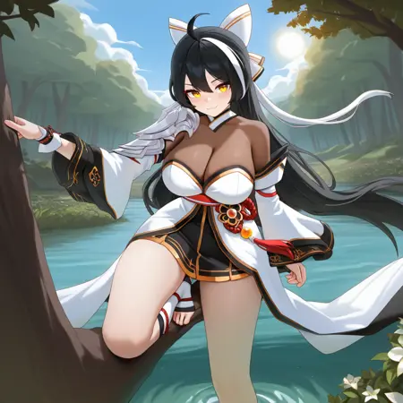 AraEL, Fol002, Arh_Yam, 長髪, 黒髪, 黄色い目, ara haan, 短いドレス, ヘアクリップ, 片耳ピアス, 多色のドレス, 白いドレス, 黒いドレス, オレンジ色のネックタッセル, 黒い毛皮トリム, 毛皮トリム付きドレス, 黒い取り外し可能なカラー, オレンジ色のルーズベルト, 肩を露出, 片側の広い袖, 片側の取り外し可能な袖, 黒いロンググローブ, 黒い太ももハイズ, 片側の太ももハイズ, 非対称な履物,