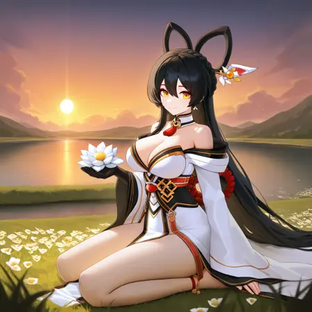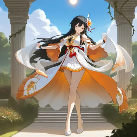 AraEL, Fol004, Arh_Aps, 黒髪, 黄色い目, ara haan, サーベルなしキモノ, 代替日本風衣装, プリーツドレス, プリーツスカート, 白いスカート, オレンジ色のトリム, 代替取り外し可能な袖, 白い短い袖, 代替広い袖, 手首バンド, 髪の花, 赤いアンダーバスト, 白いストール, 白いショール, 代替赤いロープ, 代替赤いタッセル,
