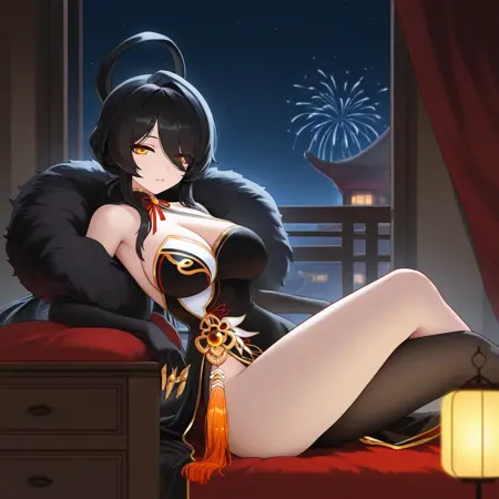 AraEL, Fol003, Arh_Dev, 黒髪, 黄色い目, ara haan, 長髪, 低めのポニーテール, 片方の目に髪をかけた状態, 片足のレッグウォーマー, 黒いレッグウォーマー, 代替非対称な履物, 肘までのグローブ, 非対称な衣装, 黒いフェザーボー, 髪の間から見える目, 肩を露出, 白いストライプ, 金のトリム, 黒いショルダーストラップ, 赤いネックリボン, 中国風ドレス, 赤いアンダースカート, 長いドレス, 代替サイドスリット, オレンジ色のタッセル, フリルスカート, 黒いドレス, 胸元, 黒いグローブ, 片側の指なしグローブ, 非対称なグローブ, 金のクロー指輪, 黒い片側の袖,