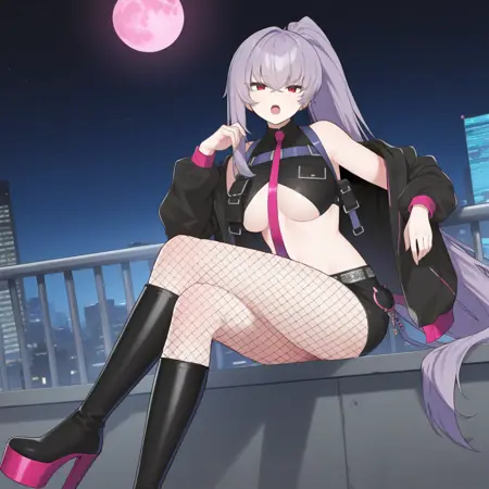 fishnet pantyhose, pouch, chain, silver belt, puffy long sleeves, magenta trim, black jacket, crop top, black shirt, short shorts, sleeveless shirt, underboob, knee boots, platform boots, high heel boots, off-shoulder jacket, magenta necktie, long necktie, chest harness, underboob cutout, collared shirt,