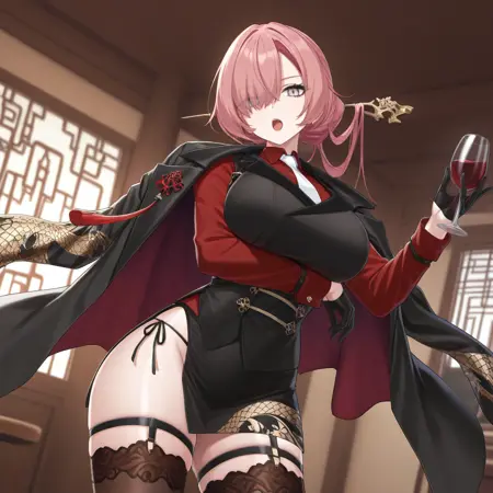 black vest, black jacket, jacket on shoulders, brown thighhighs, half gloves, wrist cuffs, sleeve garter, maroon sleeves, maroon shirt, white necktie, dragon print, maroon inner jacket, thigh strap, side-tie panties, sleeveless vest, miniskirt, black underwear, eye visible through hair, hair stick, side slit,
