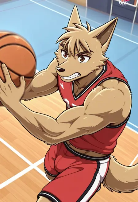 강화 프롬프트: "dingo, 개 꼬리, 털이 많은, 갈색 눈, 근육질, 탄력 있는 남성, 발달된 남성, 운동선수 같은 체형, 큰 가슴근"