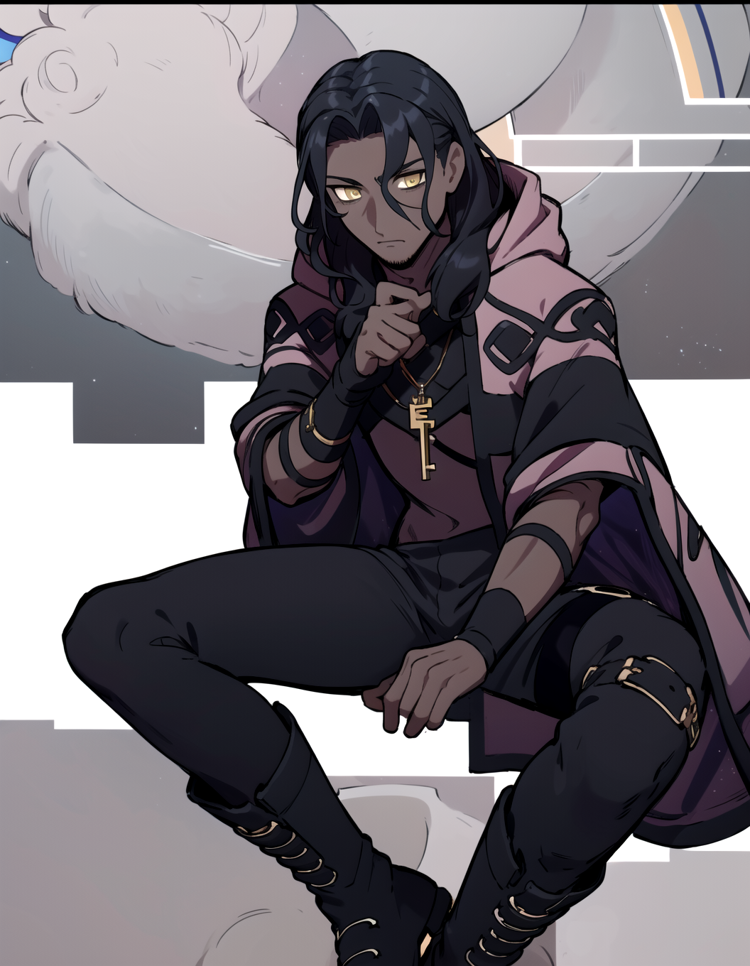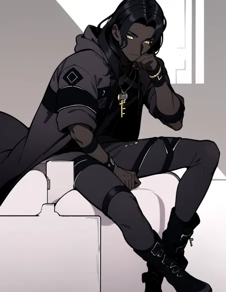 추천 프롬프트: 1boy, 노란 눈, 검은 머리, 긴 머리, 혼자, 장신구, 열쇠, 남성 중심, 부츠, 검은 피부, 검은 피부를 가진 남성