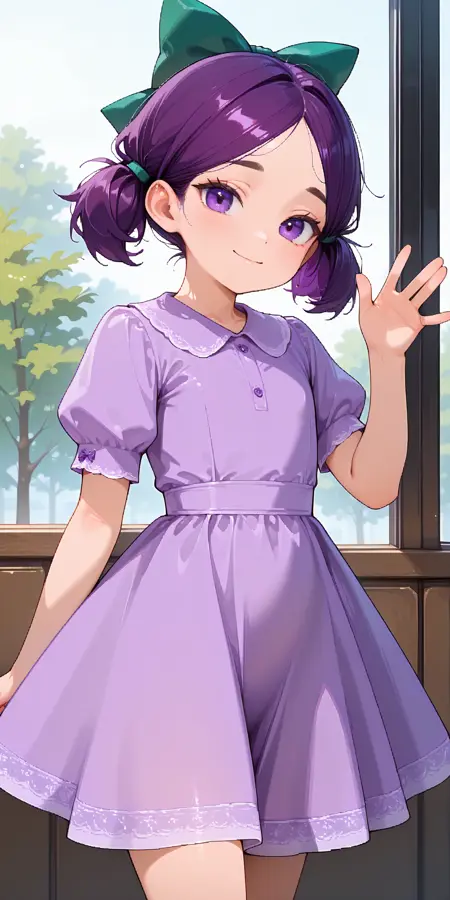 1/ パープルドレス、ふわふわの短い袖