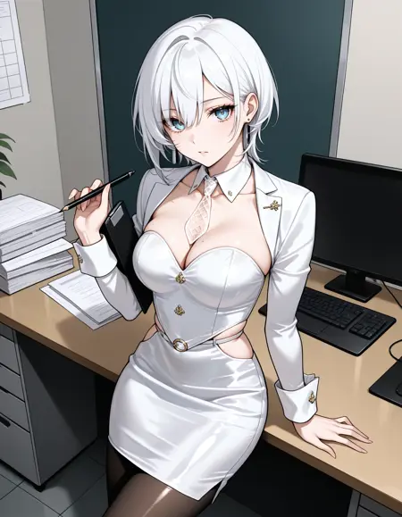 白色服装,中等胸部,白色胸衣,无肩带,腰带配件,髋部开叉,可拆卸领子,领带,网状领带,铅笔裙,连裤袜,短外套(服装),锁骨,翻领别针