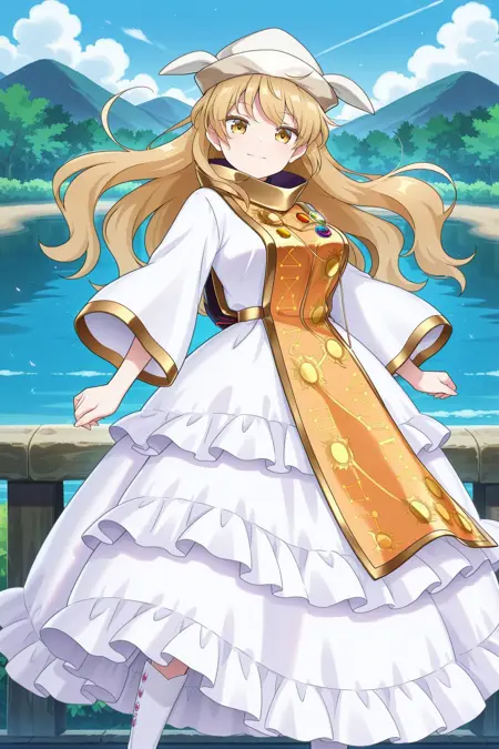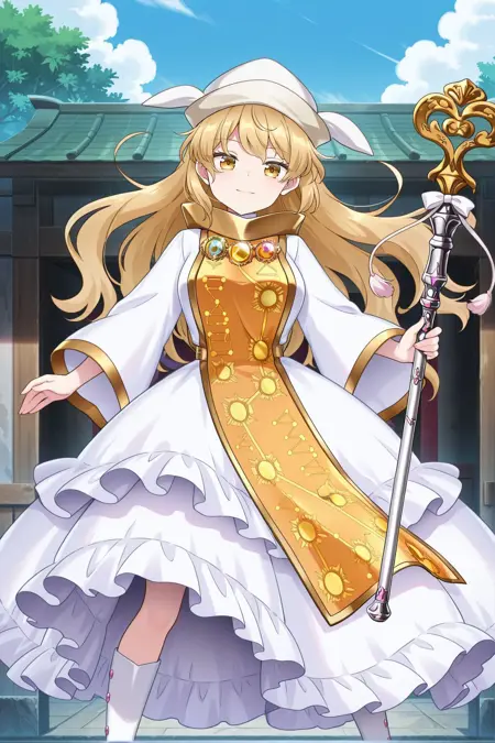 matara okina, 1girl, solo, yellow eyes, blonde hair, long hair, matara okina (隐藏于白色之中的玛卡拉神), 替代服装, 替代头饰颜色, 白色帽子, 金色高领, 金色罩衫, 镶宝石罩衫, 多色宝石, 太阳图案, 星座图案, 婚纱, 白色长裙, 花边裙, 长袖, 宽袖, 白色靴子, 手持权杖, 白色权杖,