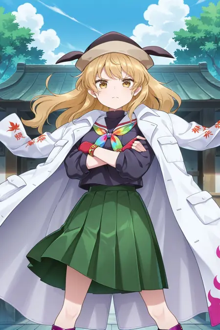 matara okina, 1girl, solo, yellow eyes, blonde hair, long hair, matara okina (幕后的学生会长), 替代服装, 帽子, 黑色头饰, 外套, 白色外套, 无指手套, 红色手套, 长袖, 黑色衬衫, 彩虹领带, 百褶裙, 绿色裙子, 过膝靴, 紫色靴子,