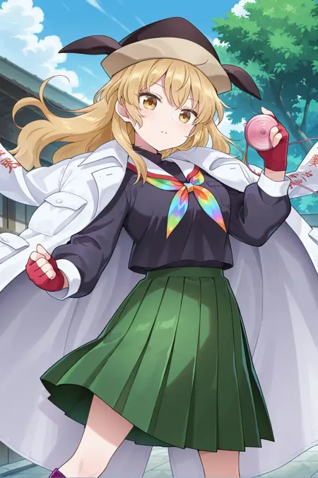 matara okina, 1girl, solo, yellow eyes, blonde hair, long hair, matara okina (幕后的学生会长), 替代服装, 黑色帽子, 白色外套, 外套搭在肩上, 外套敞开, 口袋, 多色领巾, 黑色衬衫, 长袖, 红色手套, 无指手套, 绿色裙子, 百褶裙, 过膝靴, 紫色靴子, 手持悠悠球,