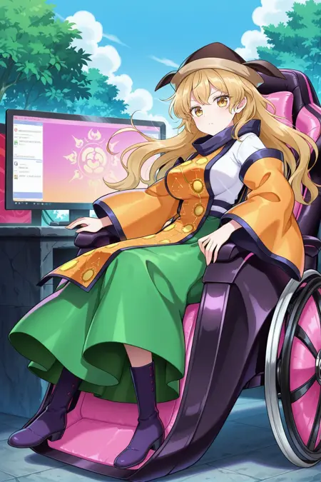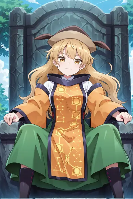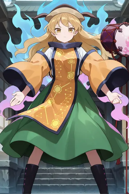 matara okina, 1girl, solo, yellow eyes, blonde hair, long hair,